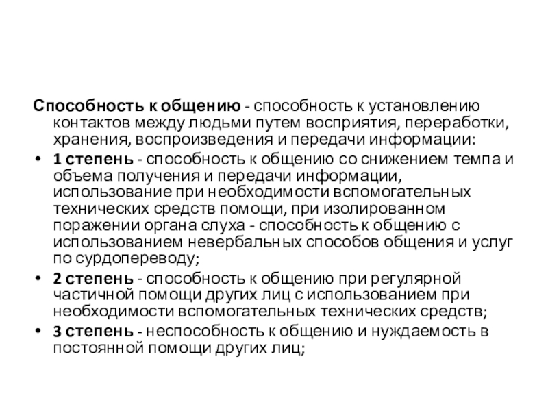 1 степень - способность к общению со снижением темпа и объема получения и передачи информации, использование при необходимости вспомогательных технических средств помощи, при изолированном поражении органа слуха - способность к общению с использованием невербальных способов общения и услуг по сурдопереводу;