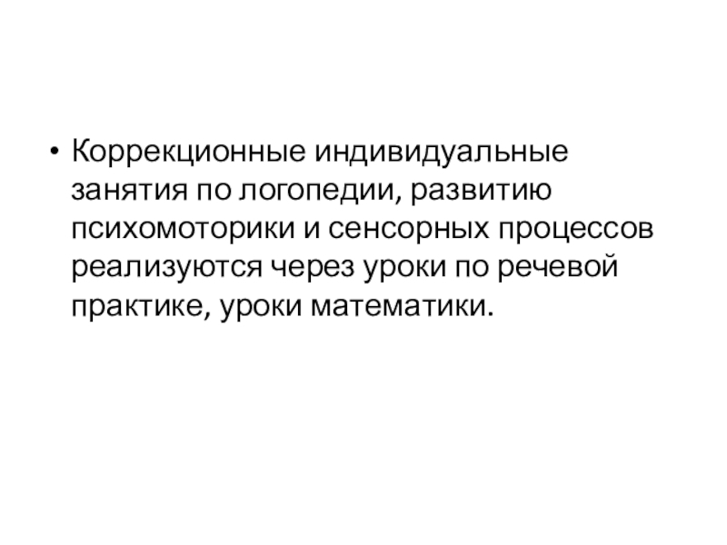 Слайд 25Коррекционные индивидуальные занятия по логопедии, развитию психомоторики и сенсорных процессов реализуются