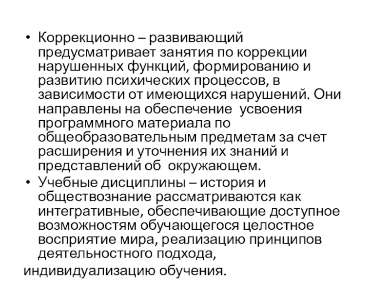 Слайд 24Коррекционно – развивающий предусматривает занятия по коррекции нарушенных функций, формированию и