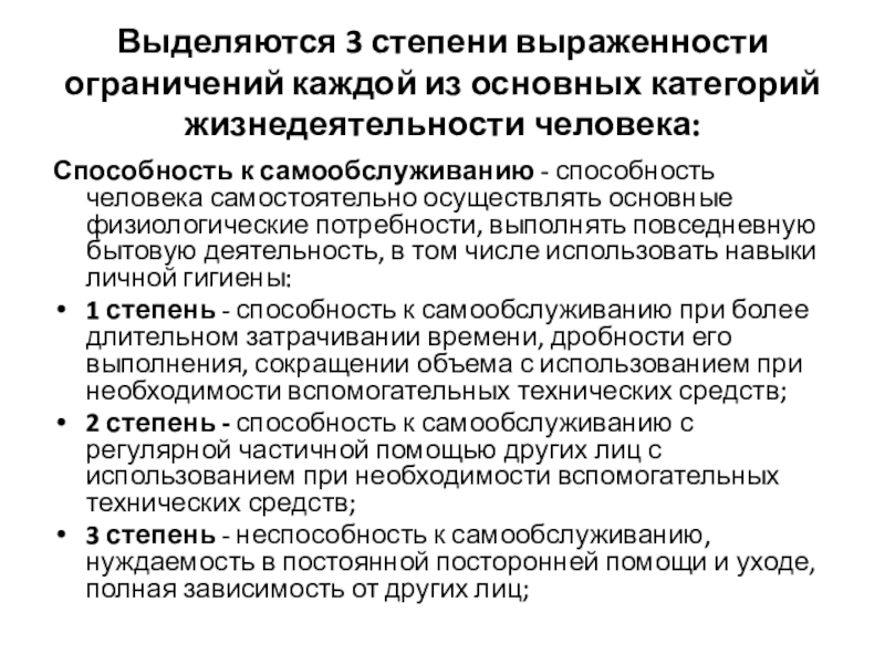 Слайд 12Выделяются 3 степени выраженности ограничений каждой из основных категорий жизнедеятельности человека: