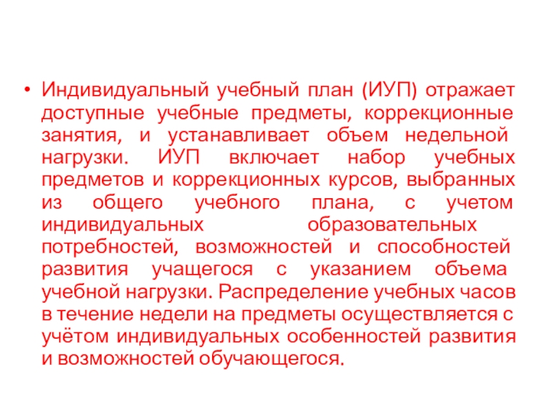 устанавливает объем недельной нагрузки. ИУП включает набор учебных предметов и коррекционных курсов, выбранных из общего учебного плана, с учетом индивидуальных образовательных потребностей, возможностей и способностей развития учащегося с указанием объема учебной нагрузки. Распределение учебных часов в течение недели на предметы осуществляется с учётом индивидуальных особенностей развития и возможностей обучающегося.