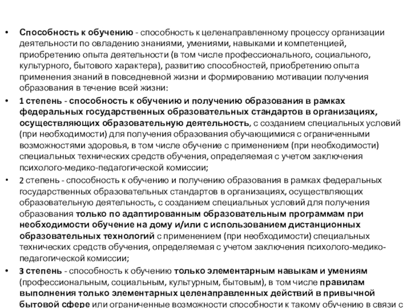 1 степень - способность к обучению и получению образования в рамках федеральных государственных образовательных стандартов в организациях, осуществляющих образовательную деятельность, с созданием специальных условий (при необходимости) для получения образования обучающимися с ограниченными возможностями здоровья, в том числе обучение с применением (при необходимости) специальных технических средств обучения, определяемая с учетом заключения психолого-медико-педагогической комиссии;