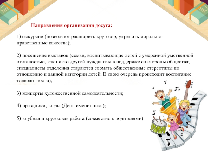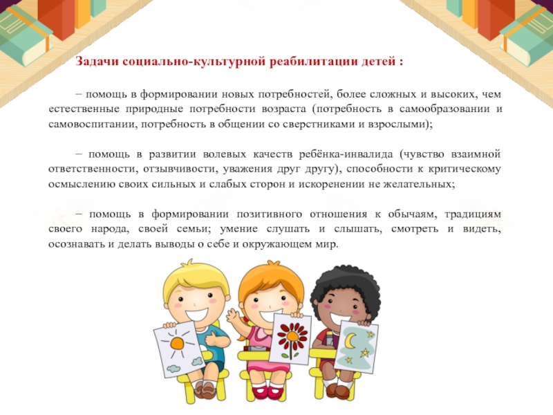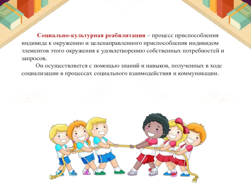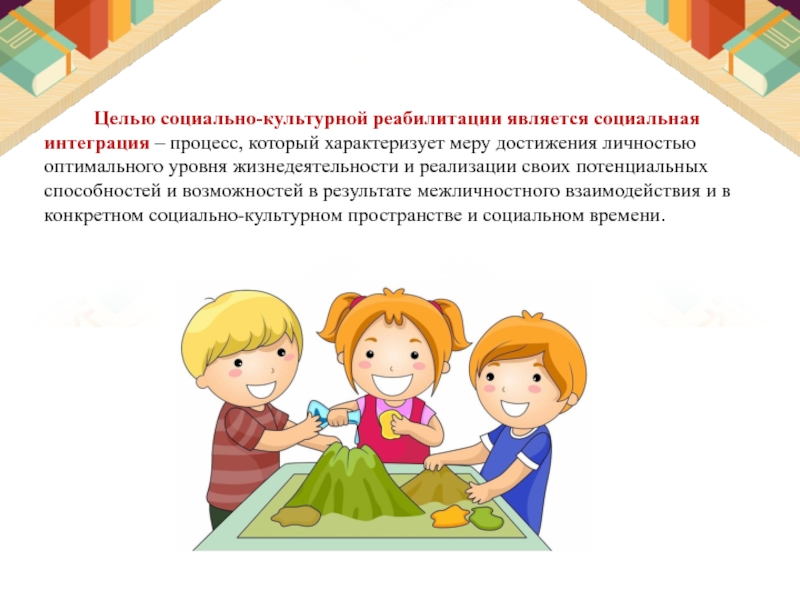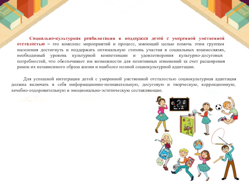 Социально-культурная реабилитация и поддержка детей с умеренной умственной отсталостью – это комплекс мероприятий и процесс, имеющий целью помочь этим группам населения достигнуть и поддержать оптимальную степень участия в социальных взаимосвязях, необходимый уровень культурной компетенции и удовлетворения культурно-досуговых потребностей, что обеспечивает им возможности для позитивных изменений за счет расширения рамок их независимого образа жизни и наиболее полной социокультурной адаптации.