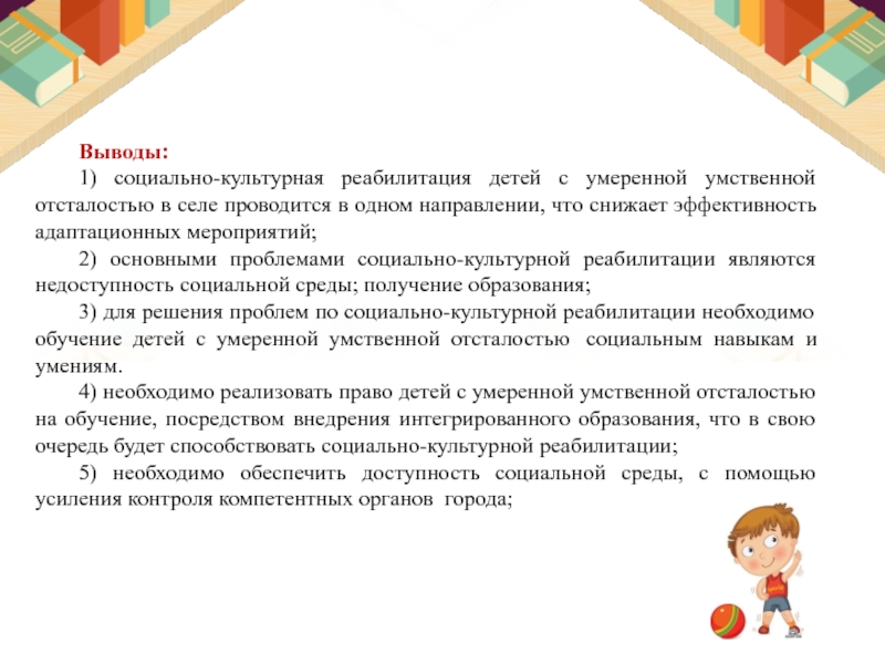 Проблемой социокультурной реабилитации является недостаточно активная жизненная позиция и низкая эффективность мероприятий для детей с умеренной умственной отсталостью.