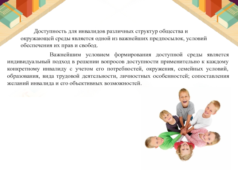 Важнейшим условием формирования доступной среды является индивидуальный подход в решении вопросов доступности применительно к каждому конкретному инвалиду с учетом его потребностей, окружения, семейных условий, образования, вида трудовой деятельности, личностных особенностей; сопоставления желаний инвалида и его объективных возможностей.
