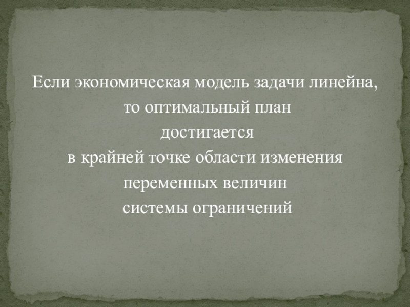 Если экономическая модель задачи линейна, то оптимальный план достигается в крайней точке области изменения переменных величин системы