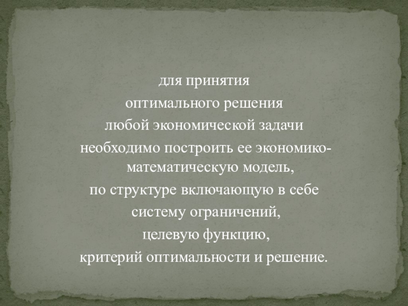 для принятия оптимального решения любой экономической задачи необходимо построить ее экономико-математическую модель, по структуре включающую в себе