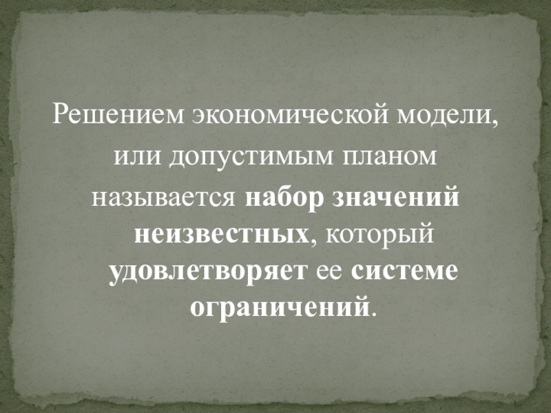 Решением экономической модели, или допустимым планом называется набор значений неизвестных, который удовлетворяет ее системе ограничений.