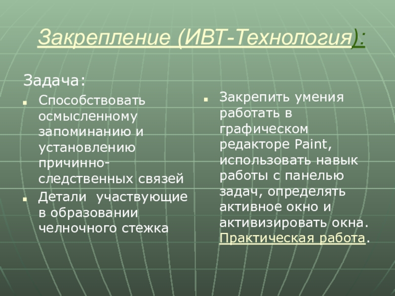 Закрепить умения работать в графическом редакторе Paint, использовать навык работы с панелью задач, определять активное окно и активизировать окна. Практическая работа.