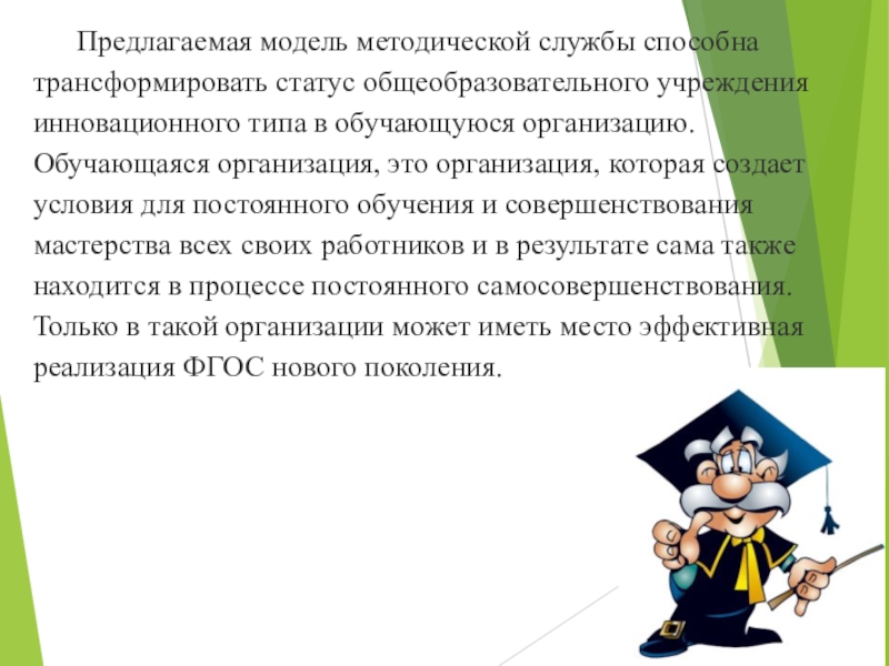Слайд 21Предлагаемая модель методической службы способна трансформировать статус общеобразовательного учреждения инновационного типа