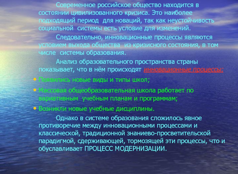 Однако в системе образования сложилось явное противоречие между инновационными процессами и классической, традиционной знаниево-просветительской парадигмой, сдерживающей, тормозящей эти процессы, что и обуславливает ПРОЦЕСС МОДЕРНИЗАЦИИ.
