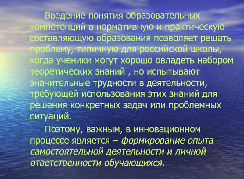 Введение понятия образовательных компетенций в нормативную и практическую составляющую образования позволяет