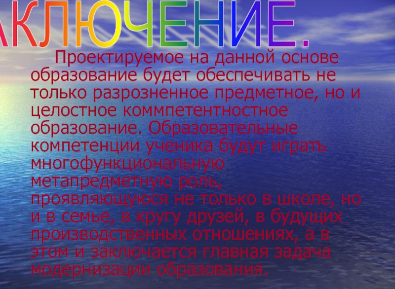 но и целостное коммпетентностное образование. Образовательные компетенции ученика будут играть многофункциональную метапредметную роль, проявляющуюся не только в школе, но и в семье, в кругу друзей, в будущих производственных отношениях, а в этом и заключается главная задача модернизации образования.