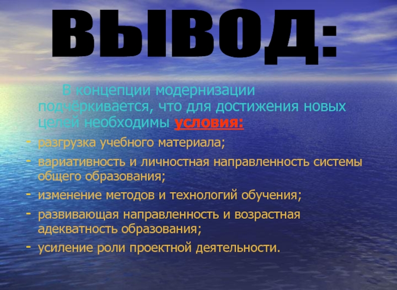 Слайд 7 В концепции модернизации подчёркивается, что для достижения новых целей необходимы условия: