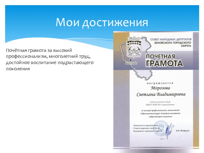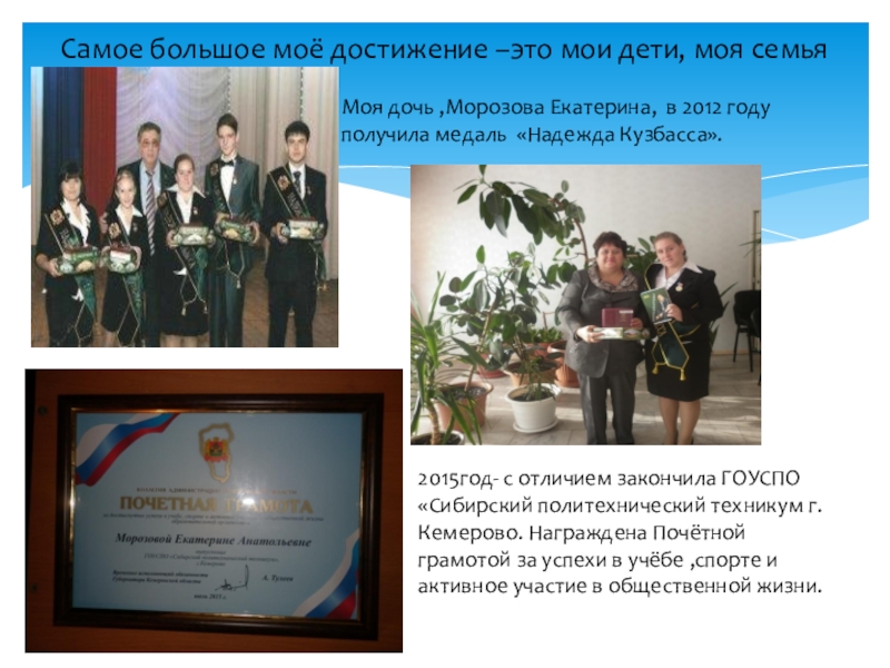2015год- с отличием закончила ГОУСПО «Сибирский политехнический техникум г.Кемерово. Награждена Почётной грамотой за успехи в учёбе ,спорте и активное участие в общественной жизни.
