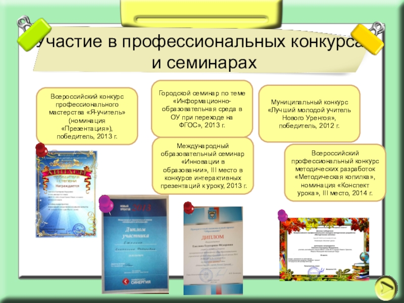 Всероссийский конкурс профессионального мастерства «Я-учитель»(номинация «Презентация»), победитель, 2013 г.