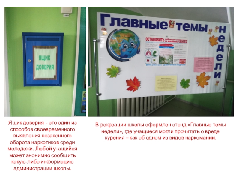 Ящик доверия - это один из способов своевременного выявления незаконного оборота наркотиков среди молодежи. Любой учащийся может анонимно сообщить какую-либо информацию администрации школы.