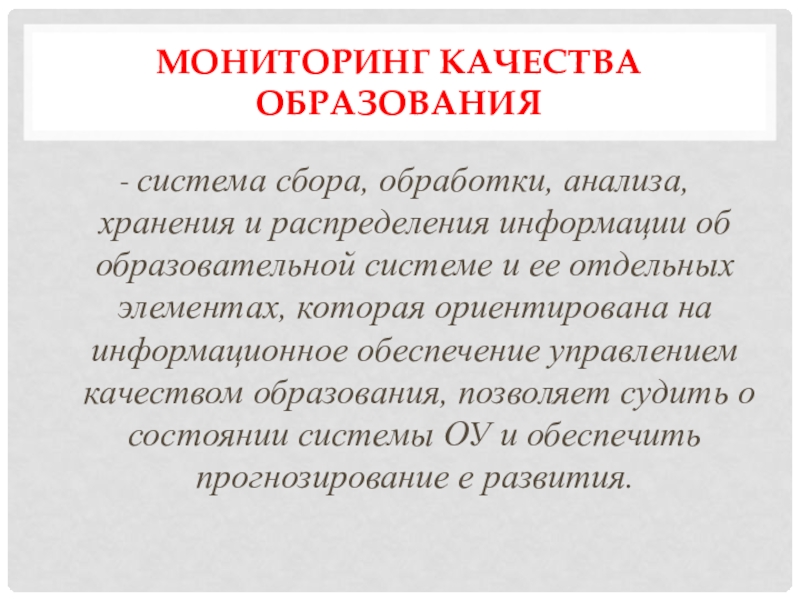 Мониторинг качества образования- cистема сбора, обработки, анализа, хранения и распределения информации об образовательной системе и ее отдельных