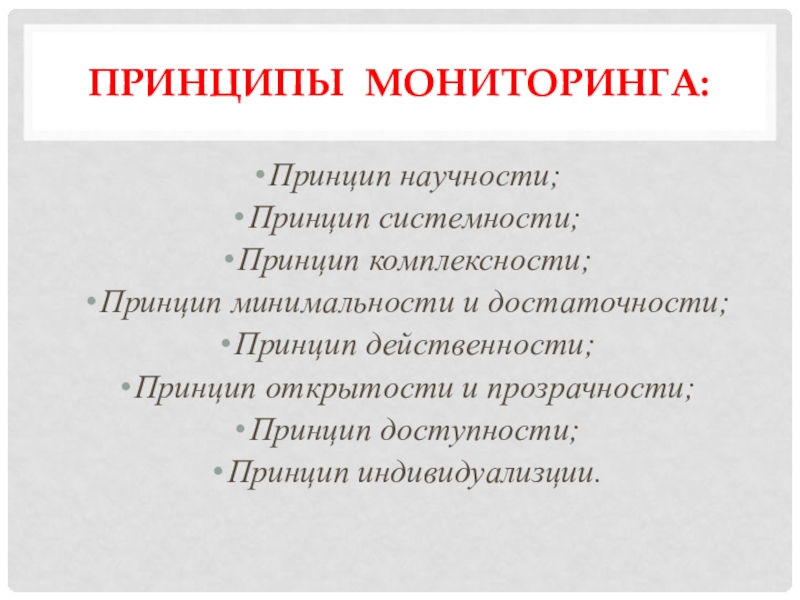 Принципы мониторинга:Принцип научности;Принцип системности;Принцип комплексности;Принцип минимальности и достаточности;Принцип действенности;Принцип открытости и прозрачности;Принцип доступности;Принцип индивидуализции.