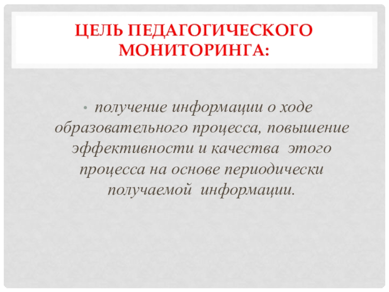 Цель педагогического мониторинга: получение информации о ходе образовательного процесса, повышение эффективности и качества этого процесса на основе