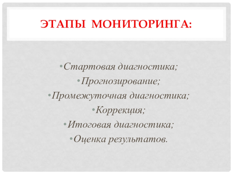 Этапы мониторинга:Стартовая диагностика;Прогнозирование;Промежуточная диагностика;Коррекция;Итоговая диагностика;Оценка результатов.