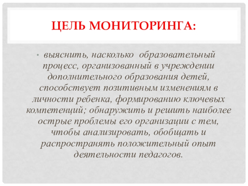 Цель мониторинга: выяснить, насколько образовательный процесс, организованный в учреждении дополнительного образования детей, способствует позитивным изменениям в личности