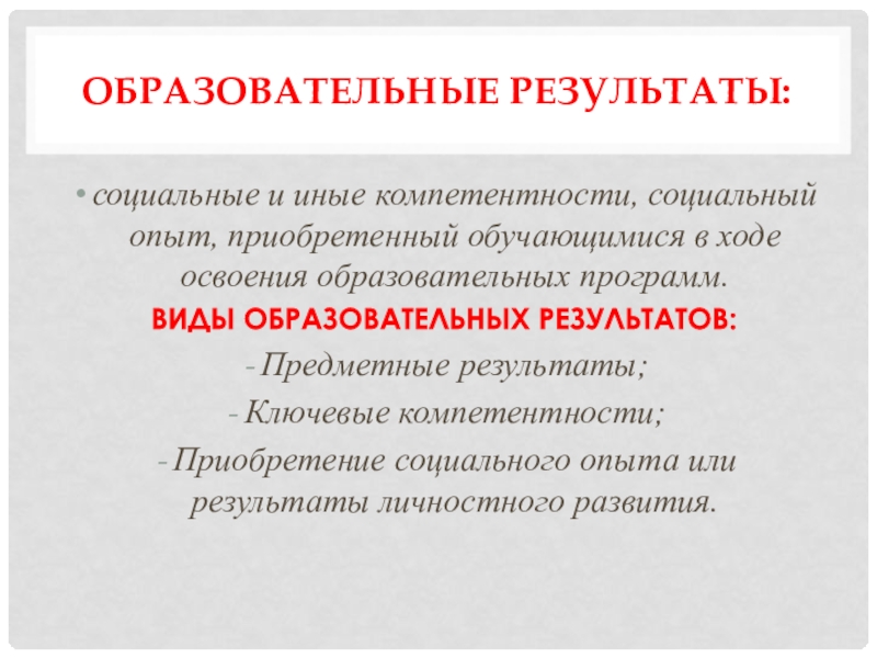 Образовательные результаты:социальные и иные компетентности, социальный опыт, приобретенный обучающимися в ходе освоения образовательных программ.ВИДЫ ОБРАЗОВАТЕЛЬНЫХ РЕЗУЛЬТАТОВ:Предметные результаты;Ключевые