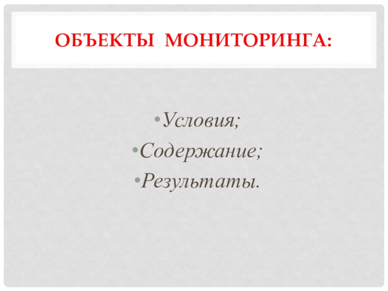 Объекты мониторинга:Условия;Содержание;Результаты.