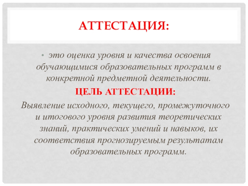 Аттестация: это оценка уровня и качества освоения обучающимися образовательных программ в конкретной предметной деятельности.ЦЕЛЬ АТТЕСТАЦИИ:Выявление исходного, текущего,