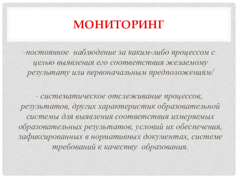 МОНИТОРИНГпостоянное наблюдение за каким-либо процессом с целью выявления его соответствия желаемому результату или первоначальным предположениям/ систематическое отслеживание процессов, результатов, других характеристик образовательной системы для выявления соответствия измеряемых образовательных результатов, условий их обеспечения, зафиксированных в нормативных документах,