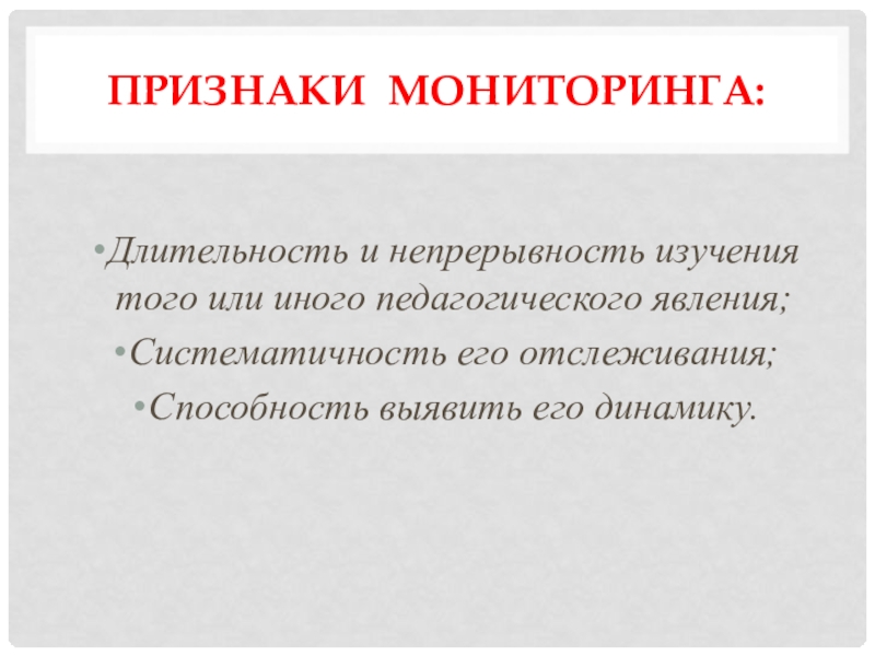 Признаки мониторинга:Длительность и непрерывность изучения того или иного педагогического явления;Систематичность его отслеживания;Способность выявить его динамику.