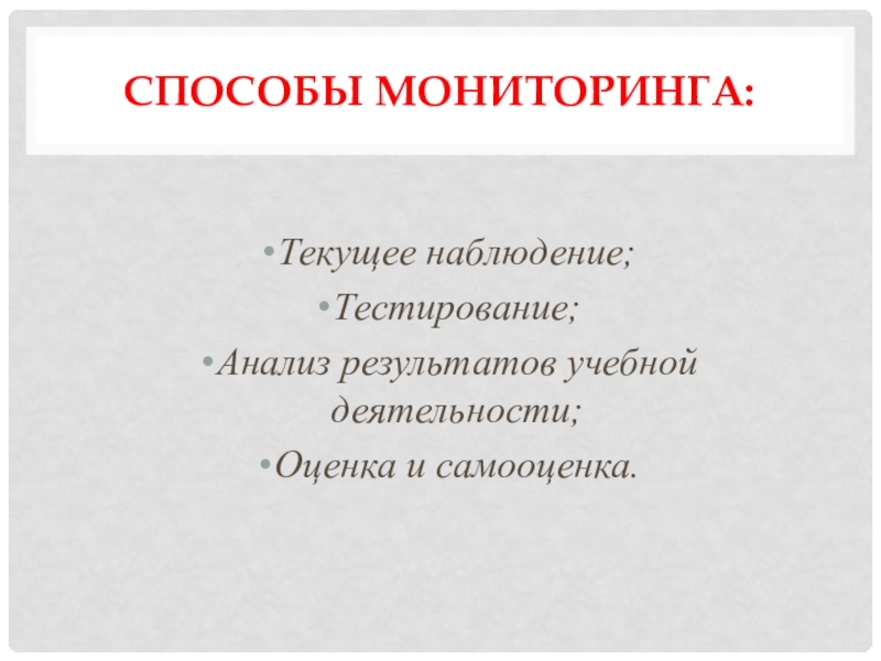 Способы мониторинга:Текущее наблюдение;Тестирование;Анализ результатов учебной деятельности; Оценка и самооценка.