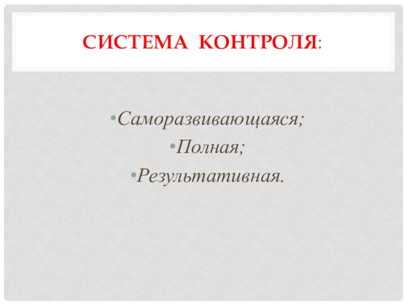 Система контроля:Саморазвивающаяся;Полная;Результативная.
