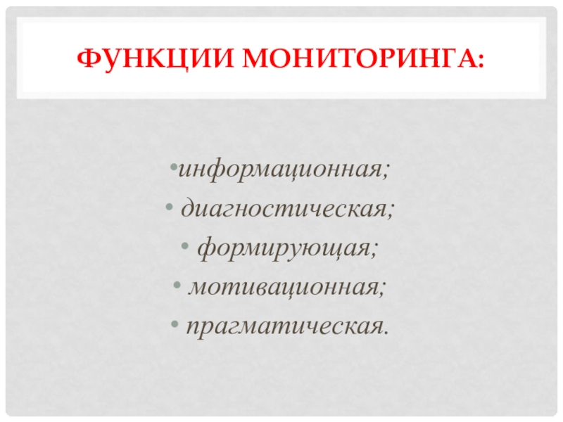 Функции мониторинга:информационная; диагностическая; формирующая; мотивационная; прагматическая.
