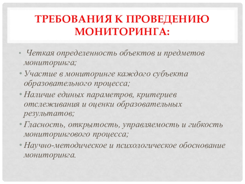 Требования к проведению мониторинга: Четкая определенность объектов и предметов мониторинга;Участие в мониторинге каждого субъекта образовательного процесса; Наличие
