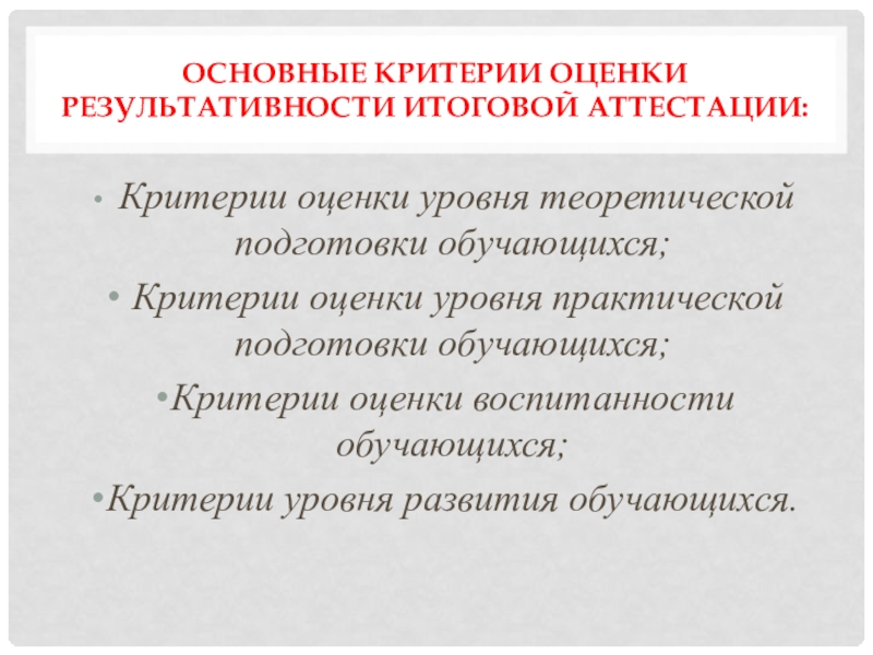 Слайд 11Основные критерии оценки результативности итоговой аттестации: