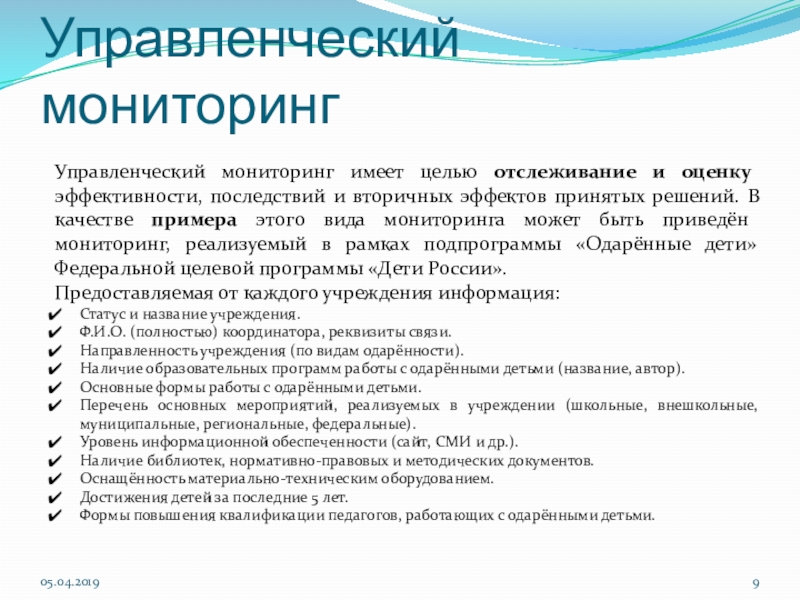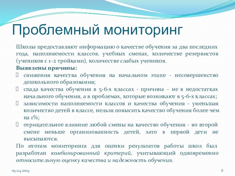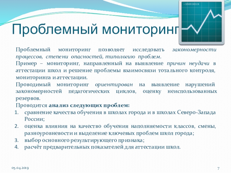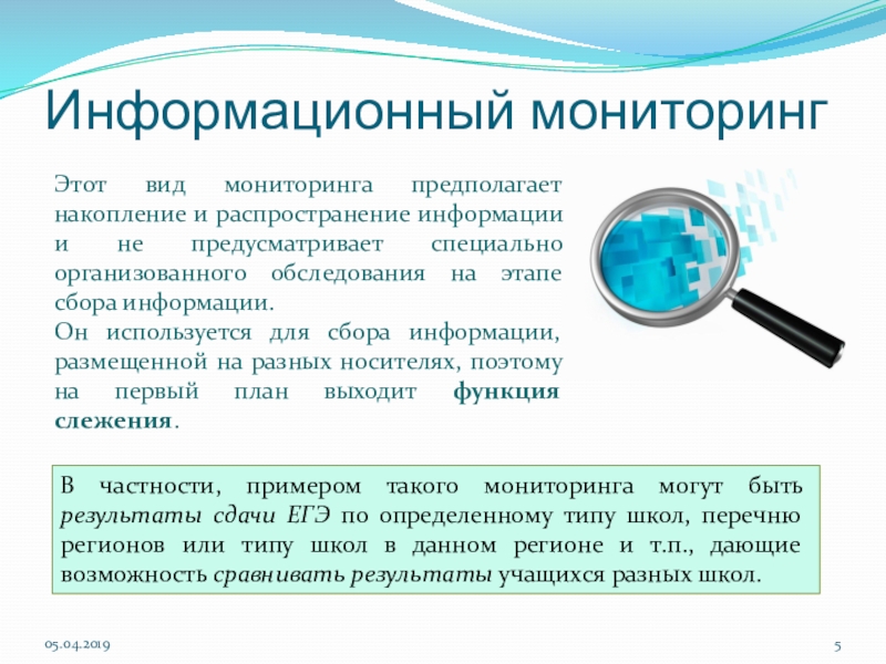 В частности, примером такого мониторинга могут быть результаты сдачи ЕГЭ по определенному типу школ, перечню регионов или типу школ в данном регионе и т.п., дающие возможность сравнивать результаты учащихся разных школ.