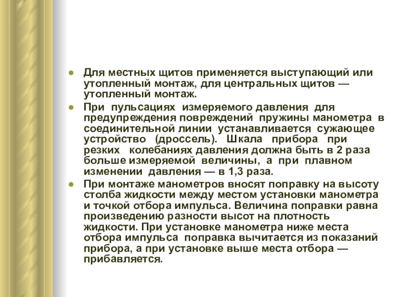 При монтаже манометров вносят поправку на высоту столба жидкости между местом установки манометра и точкой отбора импульса. Величина поправки равна произведению разности высот на плотность жидкости. При установке манометра ниже места отбора импульса поправка вычитается из показаний прибора, а при установке выше места отбора — прибавляется.