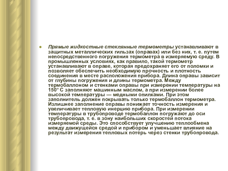 Прямые жидкостные стеклянные термометры устанавливают в защитных металлических гильзах (оправах) или