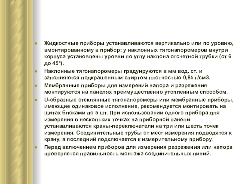 Жидкостные приборы устанавливаются вертикально или по уровню, вмонтированному в прибор; у