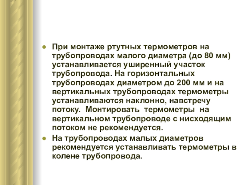 устанавливается уширенный участок трубопровода. На горизонтальных трубопроводах диаметром до 200 мм и на вертикальных трубопроводах термометры устанавливаются наклонно, навстречу потоку. Монтировать термометры на вертикальном трубопроводе с нисходящим потоком не рекомендуется.