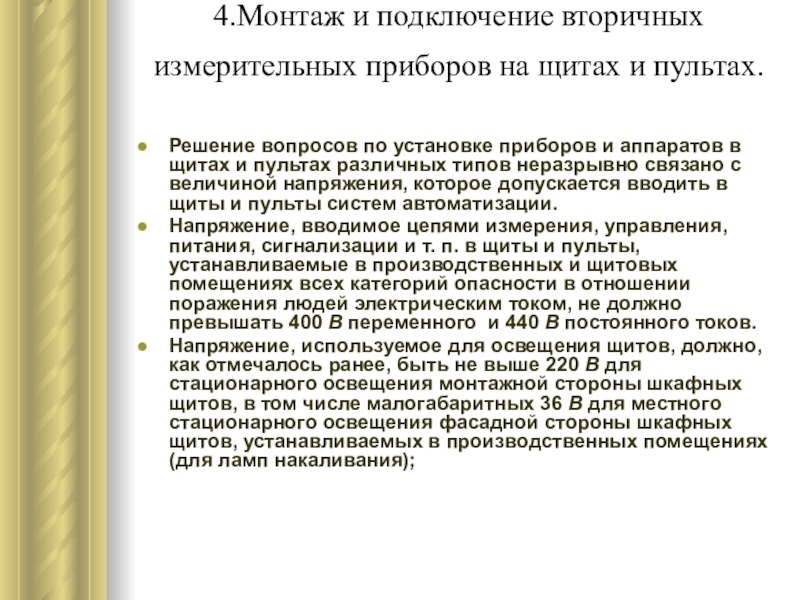 вопросов по установке приборов и аппаратов в щитах и пультах различных типов неразрывно связано с величиной напряжения, которое допускается вводить в щиты и пульты систем автоматизации.
