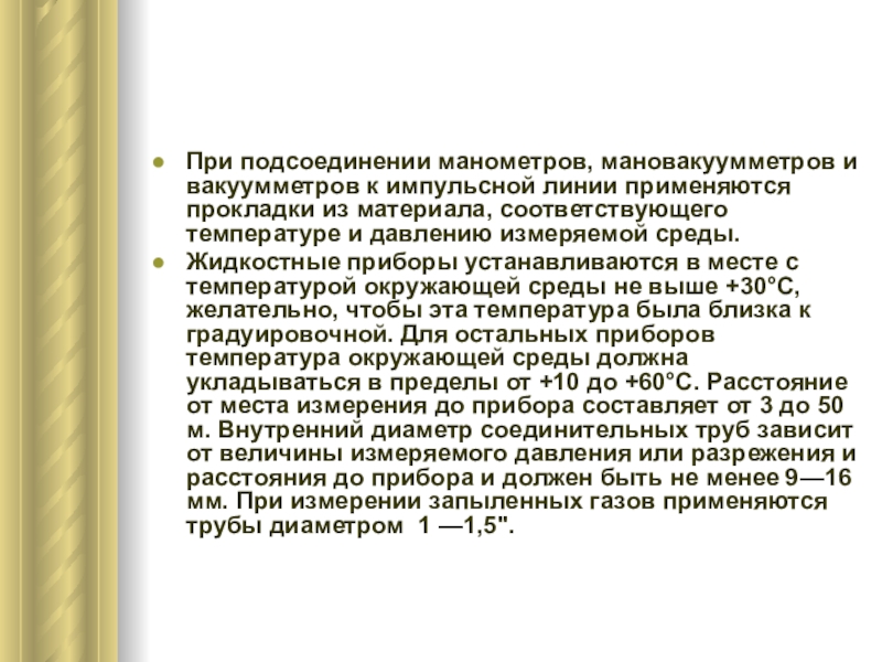 Жидкостные приборы устанавливаются в месте с температурой окружающей среды не выше +30°С, желательно, чтобы эта температура была близка к градуировочной. Для остальных приборов температура окружающей среды должна укладываться в пределы от +10 до +60°С. Расстояние от места измерения до прибора составляет от 3 до 50 м. Внутренний диаметр соединительных труб зависит от величины измеряемого давления или разрежения и расстояния до прибора и должен быть не менее 9—16 мм. При измерении запыленных газов применяются трубы диаметром 1 —1,5".