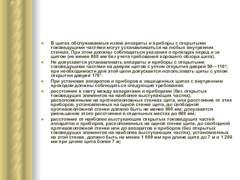 При установке аппаратов и приборов в защищенных щитах с внутренним проходом должны соблюдаться следующие требования: