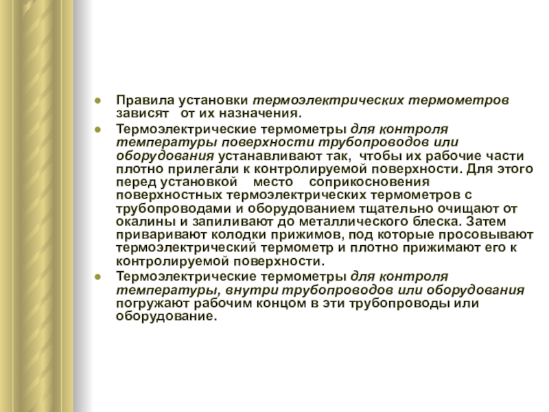 Термоэлектрические термометры для контроля температуры, внутри трубопроводов или оборудования погружают рабочим концом в эти трубопроводы или оборудование.