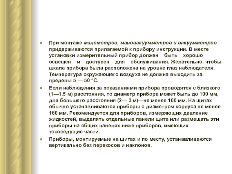 При монтаже манометров, мановакуумметров и вакуумметров придерживаются прилагаемой к прибору инструкции.