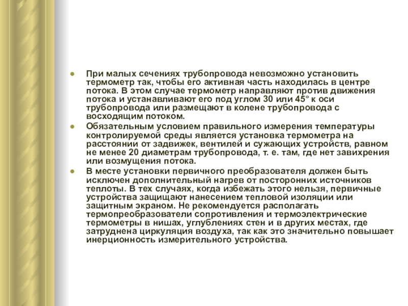 При малых сечениях трубопровода невозможно установить термометр так, чтобы его активная