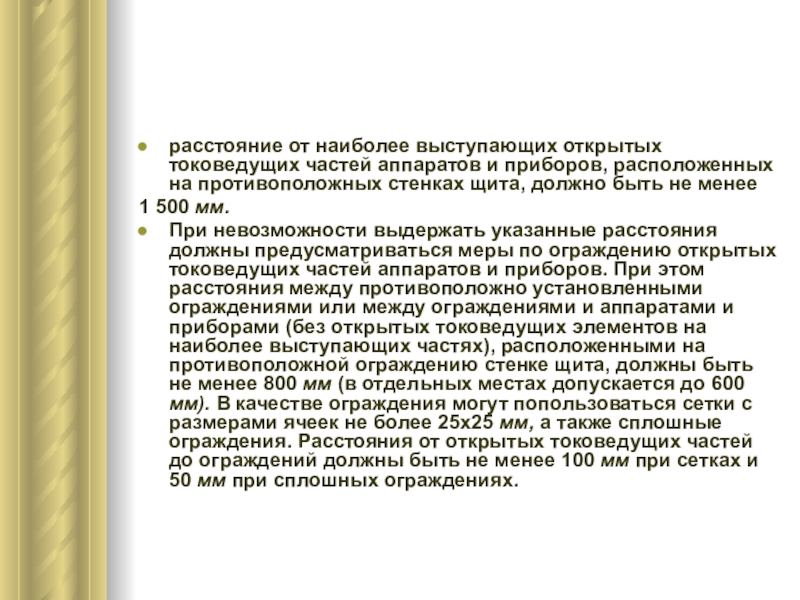 расстояние от наиболее выступающих открытых токоведущих частей аппаратов и приборов, расположенных на одной стенке щита, до свободной противоположной стенки или до аппаратов и приборов (без открытых токоведущих элементов на наиболее выступающих частях), установленных на этой стенке, должно быть не менее 1 000 мм при длине щита до 7 м и 1 200 мм при длине щита более 7 м;