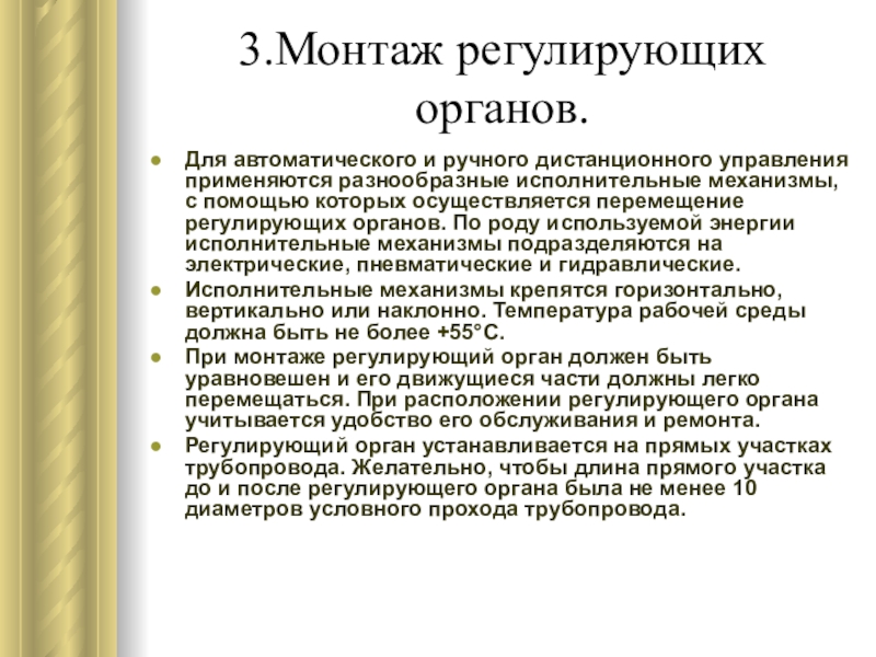При монтаже регулирующий орган должен быть уравновешен и его движущиеся части должны легко перемещаться. При расположении регулирующего органа учитывается удобство его обслуживания и ремонта.
