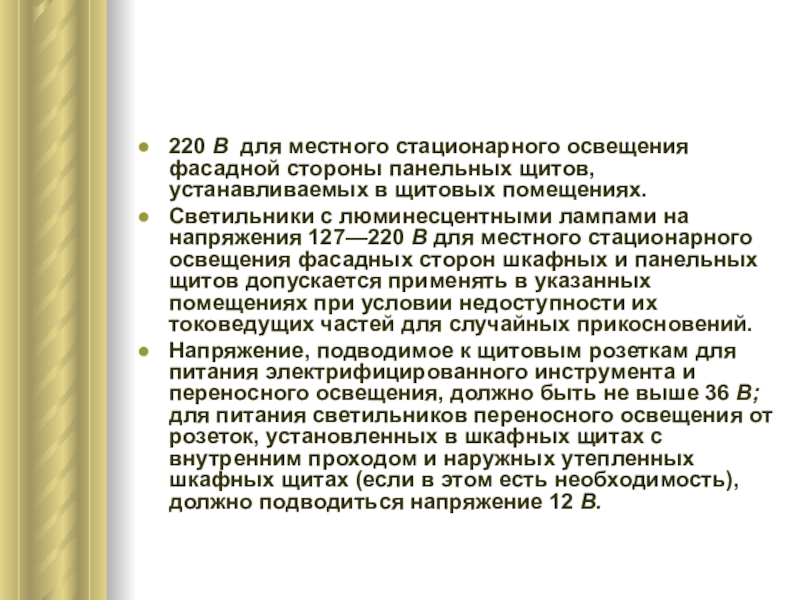 220 В для местного стационарного освещения фасадной стороны панельных щитов, устанавливаемых